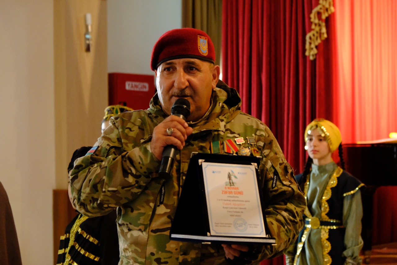 “Birinci və ikinci Qarabağ müharibəsində döyüşən, xüsusi təyinatlı kəşfiyyatçı Vidadi Ağagülov çıxış edərək: “Uzun illər boyu xalqımız bu tarixi ədalətin təntənəsini gözləyirdi. 44 günlük Vətən müharibəsi və tarixi qələbəmiz Azərbaycan xalqının nəyə qadir olduğunu göstərdi. Azərbaycan xalqının 30 illik arzusu, 30 illik duası həyata keçdi”- deyə bildirdi: “İllər keçsə də xalqımız bu günləri unutmayacaq. Böyüyən nəsil bu qəhrəmanlıq yoluna bələd olmalı, Vətənə məhəbbət ruhunda, şəhidlərimizə hörmət ruhunda böyüməlidir. Azərbaycanımızı irəli aparan şəhidlərimizin ruhudur”. Müharibə veteranı bütün məktəblərdə şagird stollarının üstündə bir şəhidin şəklinin olması təklifini irəli sürdü: “Bununla bağlı Təhsil Nazirliyinə də müraciət etmişəm. Bu şəkli görən şagirdlər heç vaxt dərslərini pis oxumaz. Onlara baxıb Vətəni sevərlər, vətənpərvər böyüyərlər”.