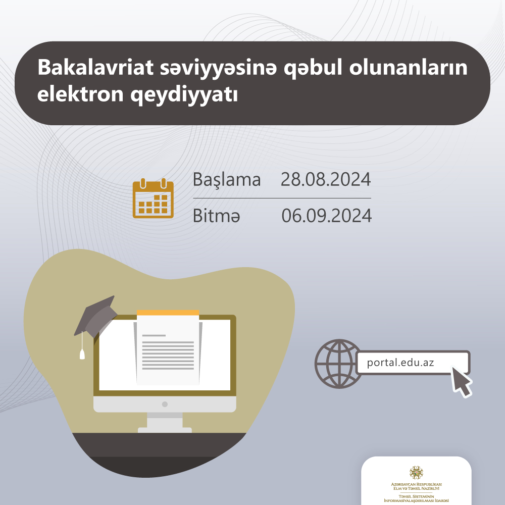 28 avqust saat 11:00-da ali təhsil müəssisələrinə bakalavriat səviyyəsi üzrə qəbul olunanlar üçün qeydiyyat prosesinə start veriləcək. Abituriyentlər https://portal.edu.az/ platformasında “Ali və orta ixtisas təhsili pilləsinə təhsilalan qeydiyyatı” xidmətini seçməklə müraciət edə bilərlər. Açılan səhifədə şəxsi və qəbul məlumatlarının təsdiqi, həmçinin tələb olunan sənədlərin əlavə edilməsi mümkündür.