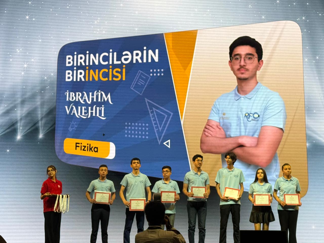 Xəbər verdiyimiz kimi, iyunun 24-də Bakı Konqres Mərkəzində Respublika Fənn Olimpiadaları qaliblərinin mükafatlandırılma mərasimi keçirilib. Böyük qürur və fərəh doğuran haldır ki, Kaspi Liseyinin şagirdi İbrahim Valehli də mükafatçılar sırasındadır. Məzunumuz Fizika fənni üzrə ən yüksək mükafata layiq görülərək “Birincilərin birincisi” adını qazanıb.