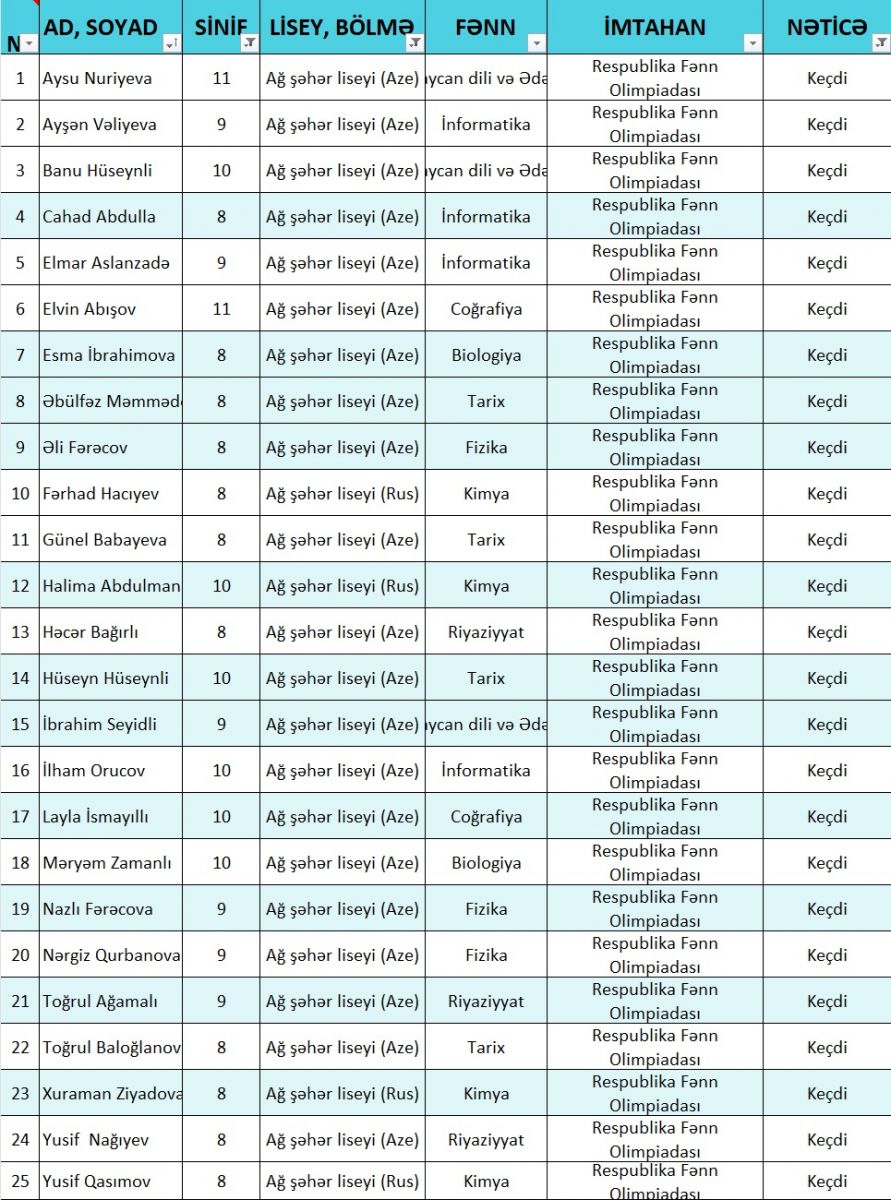 Liseydən verilən məlumata görə, Ağ Şəhər liseyi üzrə 25 şagird Olimpiadanın yarımfinal mərhələsində iştirak hüququ qazanıb.