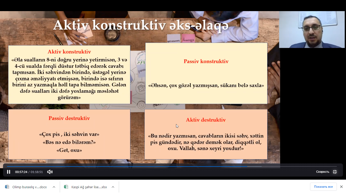 Kaspi Liseyinin Ağ Şəhər filialının İbtidai siniflər üzrə direktor müavini Mahirə  Hüseynova hesab edir ki, təlimlərdə qazanılan yeni məlumat və biliklər  həm distant həm də ənənəvi dərslərdə müəllimlərin öyrənmənin öyrədilməsində daha fəal çalışmasını təmin edəcək: “Təlimlərdə müəllimlərin dərs prosesində qarşılaşdığı problemlərin həlli yollarının araşdırılması, təlim texnologiyalarından istifadə üsulları, dərslərdə istifadə ediləcək müxtəlif fəaliyyətlər və oyunların keçirilməsi qaydaları, sosial emosional öyrənmə, dərsin mərhələləri, qiymətləndirmə, sinfin idarəedilməsi   mövzularında maraqlı məlumatlar dinlənildi”.